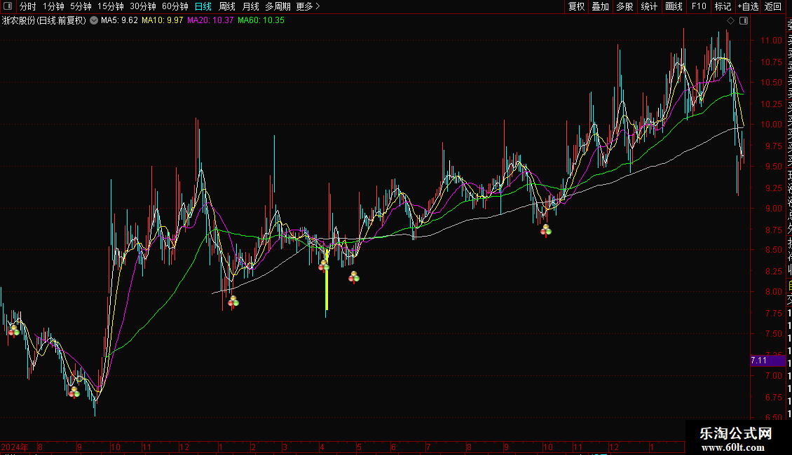 STICKLINE((CLOSE-REF(CLOSE,1))/REF(CLOSE,1)*100>9.5,CLOSE,OPEN,1.5,0),COLORYELLOW;