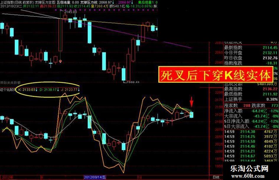 3、J值向下穿越K线实体(多为阴线)开盘价,卖出;