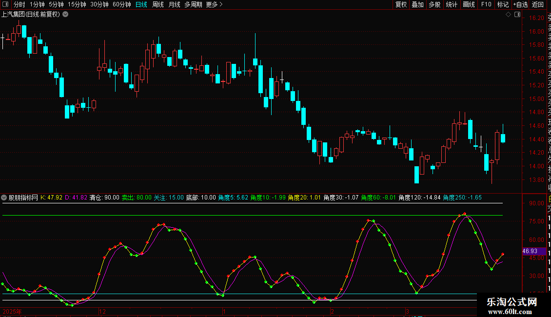 角度60:ATAN((MA60/REF(MA60,1)-1)*100)*180/3.1416 COLORGREEN NODRAW;