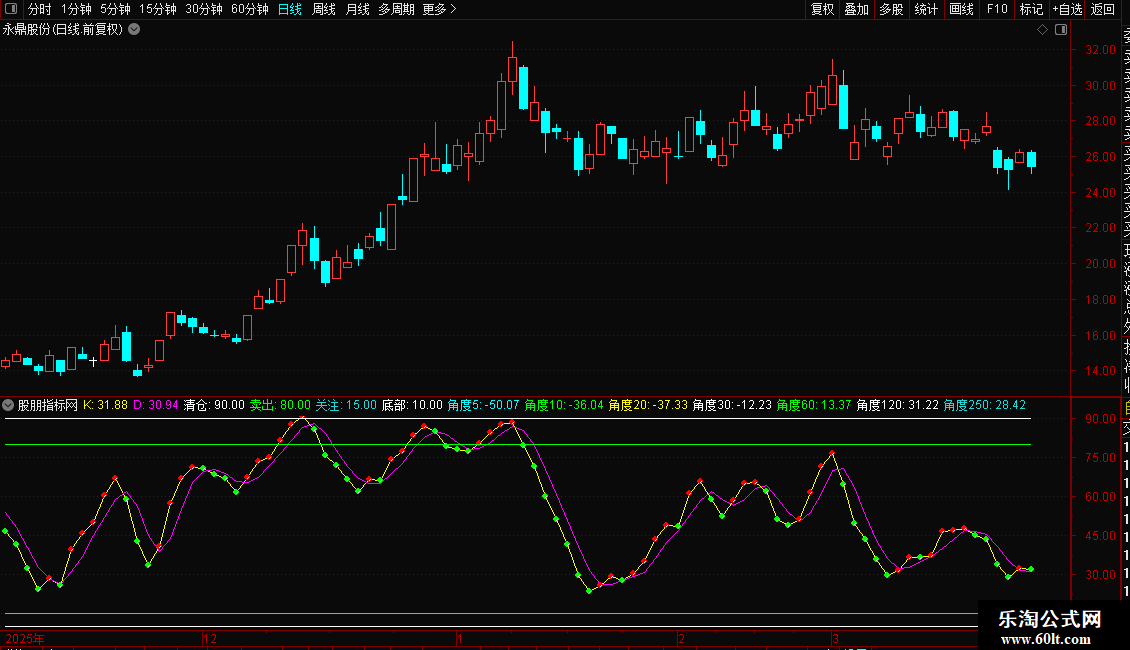 角度30:ATAN((MA30/REF(MA30,1)-1)*100)*180/3.1416 COLORWHITE NODRAW;