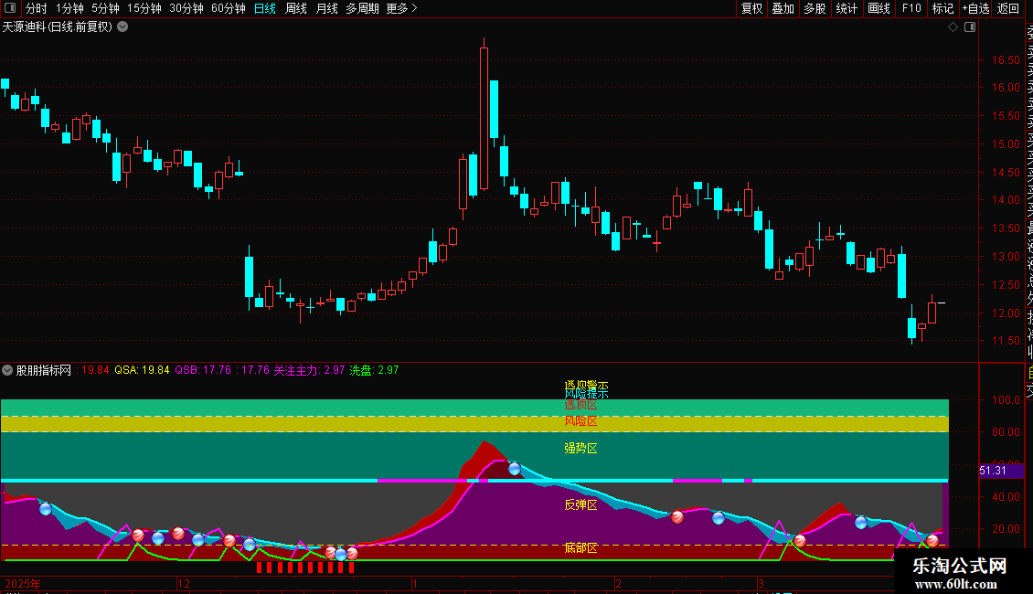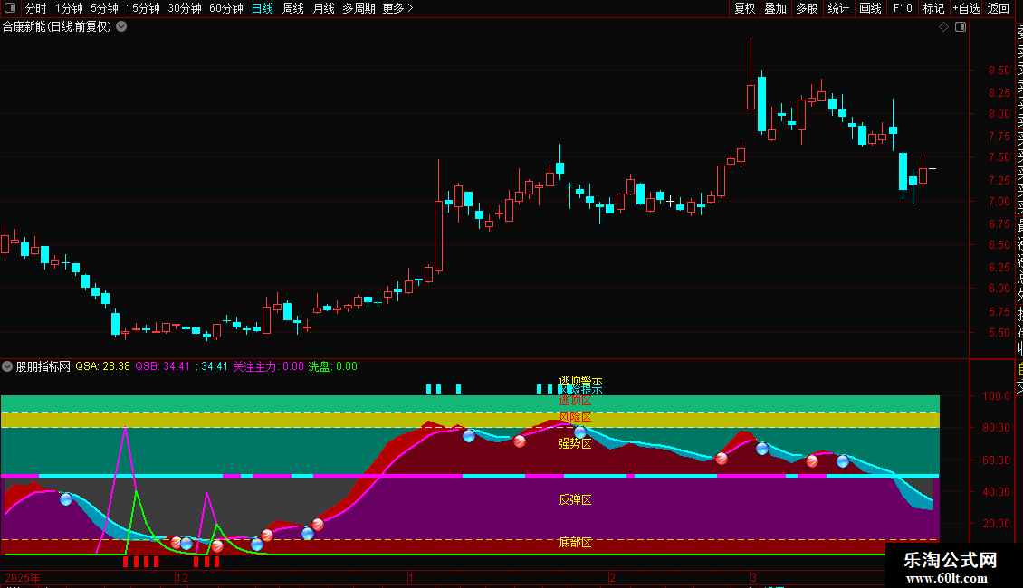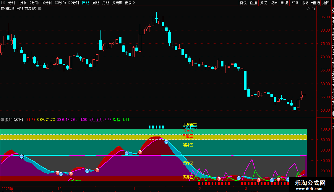 STICKLINE(C>0,0,10,5,0),COLOR00008A; STICKLINE(C>0,10,50,5,0),COLOR63006A; STICKLINE(C>0,50,80,5,0),COLOR657600; STICKLINE(C>0,80,90,5,0),COLOR00BBBB; STICKLINE(C>0,90,100,5,0),COLOR79B715; 趋势A:=SMA(((CLOSE-LLV(LOW,28))/(HHV(HIGH,28)-LLV(LOW,28))*100),3,1) ,COLORGREEN,LINETHICK2; DRAWBAND(趋势A,RGB(110,0,20),50,RGB(60,60,60)); IF(趋势A>REF(趋势A,1), 趋势A,DRAWNULL), COLORRED,LINETHICK2; 趋势B:=SMA(趋势A,3,1),COLOR00FFFF, LINETHICK2; QSA:趋势A; QSB:趋势B; DRAWBAND(QSA,RGB(180,0,0),QSB,RGB(0,150,180)); IF( 趋势A>趋势B,趋势B,DRAWNULL), COLORFF00FF, LINETHICK2; IF( 趋势A<趋势B,趋势B,DRAWNULL) ,COLORFFFF00,LINETHICK2; RSV:=(CLOSE-LLV(CLOSE,9))/(HHV(CLOSE,9)-LLV(CLOSE,9))*100; K:=SMA(RSV,3,1); D:=SMA(K,3,1); TYP:=(HIGH+LOW+CLOSE)/3; CCI:=(TYP-MA(TYP,14))/(0.015*AVEDEV(TYP,14)); DIFF:=EMA(CLOSE,2)-EMA(CLOSE,55); DEA:=EMA(DIFF,6); MACD:=2*(DIFF-DEA); 拐点:=IF(K>D AND CCI>0 AND DIFF>DEA AND MACD>0,1,0); STICKLINE(拐点=1,49,51,4,0),COLORFF00FF; STICKLINE(拐点=0,49,51,4,0),COLORCYAN; VR2:=REF(LOW,1); VR3:=SMA(ABS(LOW-VR2),3,1)/SMA(MAX(LOW-VR2,0),3,1)*100; VR4:=EMA(IF(CLOSE*1.3,VR3*10,VR3/10),3); VR5:=LLV(LOW,30); VR6:=HHV(VR4,30); VR7:=IF(MA(CLOSE,58),1,0); VR8:=EMA(IF(LOW<=VR5,(VR4+VR6*2)/2,0),3)/618*VR7; VR9:=IF(VR8>100,100,VR8); 关注主力:IF(VR9>-150,VR9,0),COLORFF00FF,LINETHICK2; 洗盘:IF(VR9<REF(VR9,1),VR9,0),COLORGREEN,LINETHICK2; DRAWICON(CROSS(趋势A,趋势B),趋势A,13); DRAWICON(CROSS(趋势B,趋势A),趋势B,14); DRAWICON(CROSS(90,趋势A),98,12); STICKLINE(趋势A>=90,102,112,1,0),COLOR00FFFF; STICKLINE(趋势A>=80,102,107,1,0),COLORFFFF00; STICKLINE(趋势A<=10,-1,-7,1,0),COLOR0000FF; STICKLINE(C>0,90,90,2,0),COLORDDDDDD; STICKLINE(C>0,80,80,2,0),COLORDDDDDD; STICKLINE(C>0,10,10,2,0),COLOR00DDDD; DRAWTEXT(CURRBARSCOUNT=38,8,'底部区'),COLOR00FFFF; DRAWTEXT(CURRBARSCOUNT=38,35,'反弹区'),COLOR00FFFF; DRAWTEXT(CURRBARSCOUNT=38,70,'强势区'),COLOR00FFFF; DRAWTEXT(CURRBARSCOUNT=38,87,'风险区'),COLOR0000FF; DRAWTEXT(CURRBARSCOUNT=38,97,'逃顶区'),COLOR0000FF; DRAWTEXT(CURRBARSCOUNT=38,104,'风险提示'),COLORFFFF00; DRAWTEXT(CURRBARSCOUNT=38,110,'逃顶警示'),COLOR00FFFF;