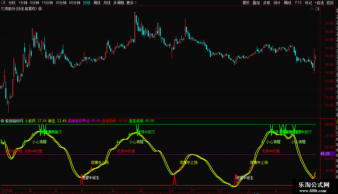 DRAWTEXT(CROSS(小股民,新庄) AND 小股民<22,20,'绝望中诞生'),COLORWHITE,LINETHICK7 ;