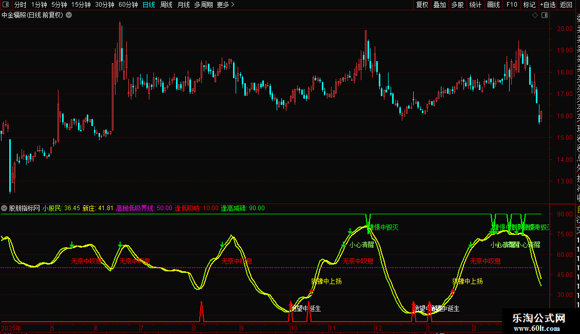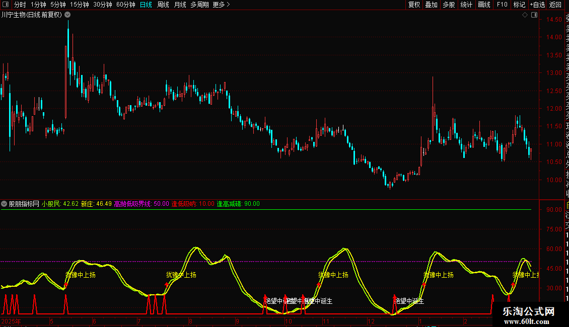 逢低吸呐: IF(CROSS(小股民,新庄) AND 小股民<40,25,10),COLORRED,LINETHICK2;