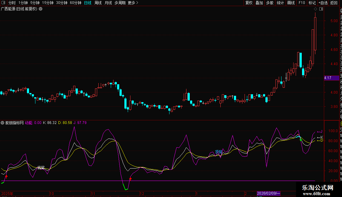 {日周月金叉:J线趟底三天左右,当J线上穿零,就是买入时机}
