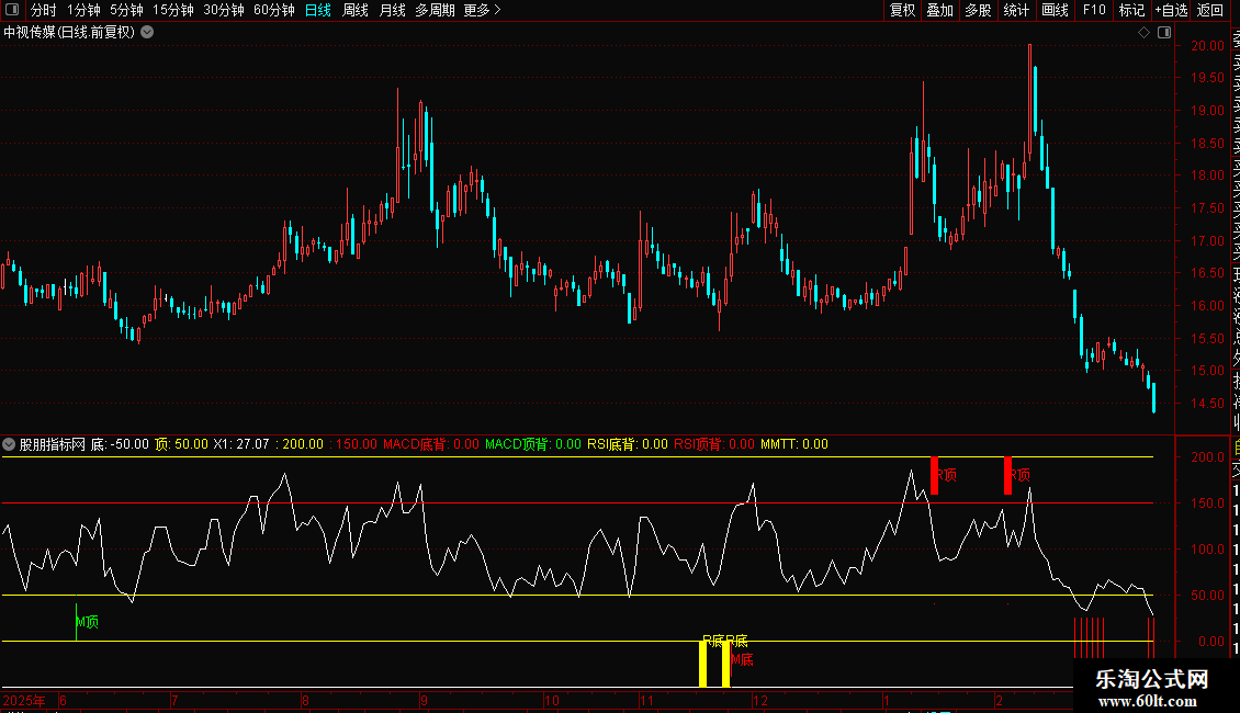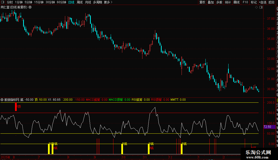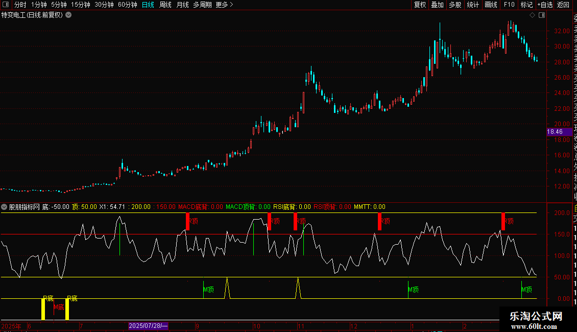 RSI顶背:IF(D3>0,40,0),COLORRED,POINTDOT;