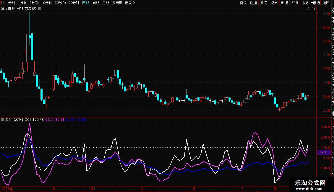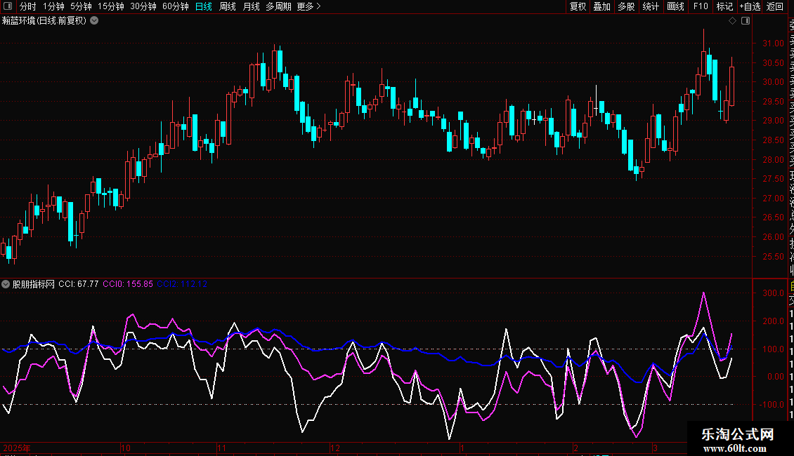 CCI3:=(TYP-MA(TYP,95))/(0.015*AVEDEV(TYP,95)),COLORLICYAN,LINETHICK2;