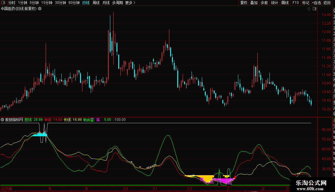 底:DRAWTEXT(CROSS(中线2,-90) AND (长线<中线 AND 长线>REF(长线,1)OR 短线<20 AND 中线<20 AND 长线<20),长线,'底'),COLORFF00FF;