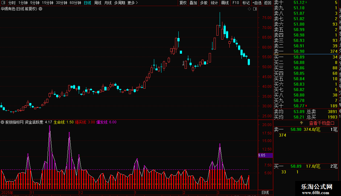 STICKLINE(XA_1<0 AND 资金活跃度>=6,0,6,1,0),COLORRED;