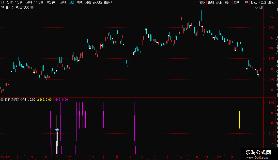 突破25:=REF(COUNT(C/REF(C,1)>1.099,3)<1,1) AND REF(O,2)<REF(H,3) AND C/O>1.037 AND C>=REF(C,3) AND C>REF(C,1) AND C>REF(C,2) AND C/O>REF(C/O,1) AND ((REF(L,2)<REF(H,3) AND REF(C/O>1.0267 AND C/REF(C,1)>1.027,5) AND (REF(C>O,3) OR (REF(C<O,3) AND C>REF(O,3))) AND REF(C/O,4)<REF(C/O,5) AND REF(C/O<1.04,4)));