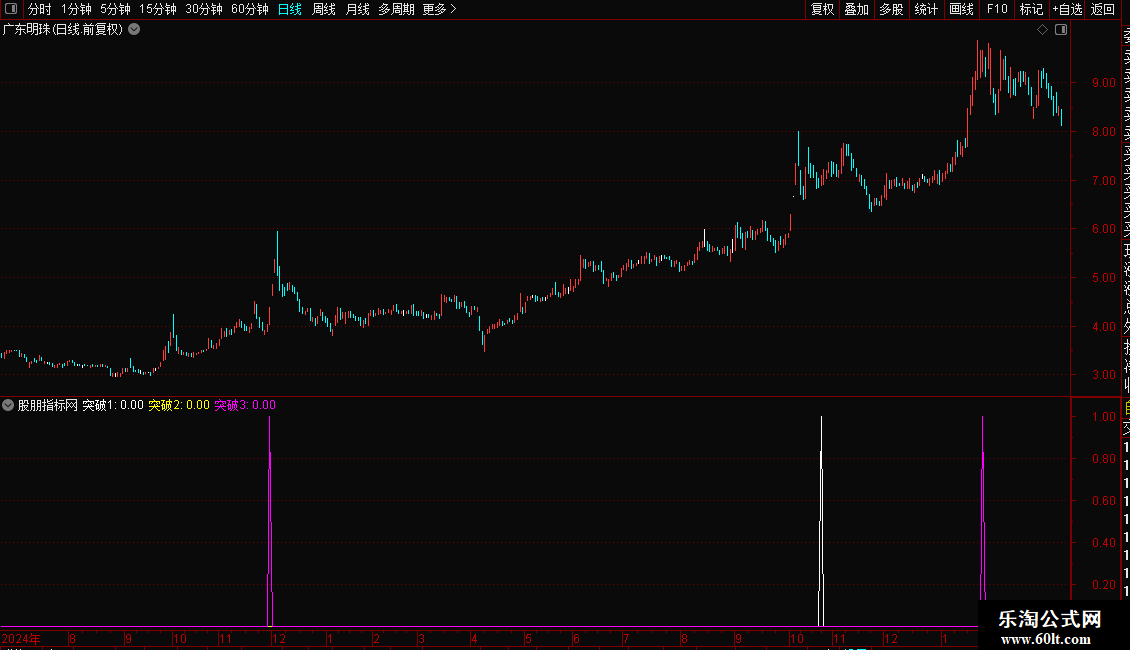 突破24:=REF(COUNT(C/REF(C,1)>1.099,3)<1,1) AND REF(O,2)<REF(H,3) AND C/O>1.037 AND C>=REF(C,3) AND C>REF(C,1) AND C>REF(C,2) AND C/O>REF(C/O,1) AND ((REF(O,2)<REF(H,3) AND REF(O,1)<=REF(H,2) AND REF(O,1)<=REF(H,2) AND REF(C/O>1.0267 AND C/REF(C,1)>1.0198,4) AND REF(C/O,3)<REF(C/O,4) AND REF(C/O<1.04 OR O<REF(C,1),3)));