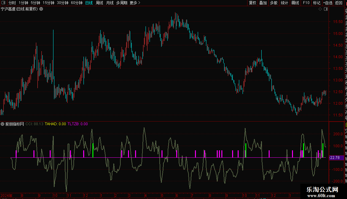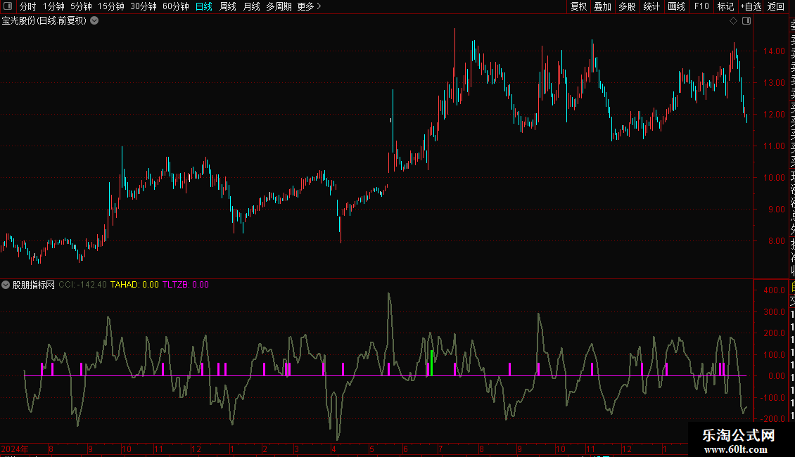 CCI:(X_1-MA(X_1,14))/(0.015*AVEDEV(X_1,14)),COLOR456456,LINETHICK2;