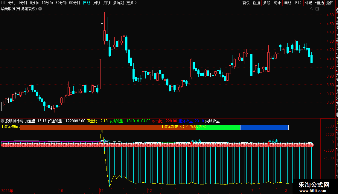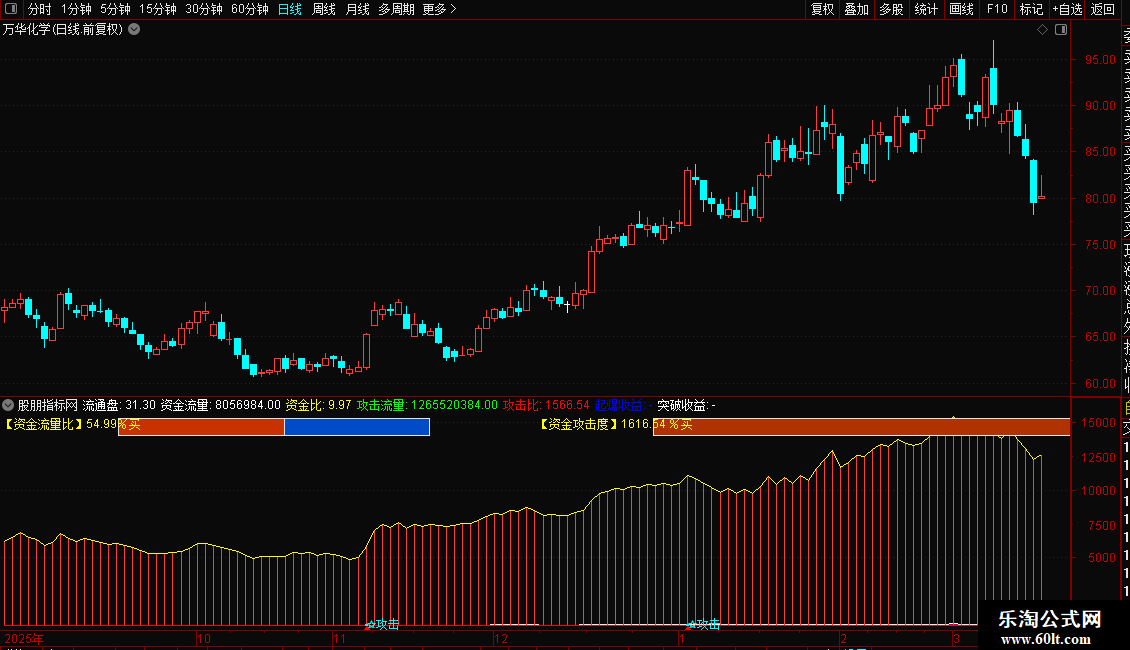 攻击量A:=SUM(IF(C>REF(C,1),攻击量*V,0),FROMOPEN),COLOR0000FF,LINETHICK0;