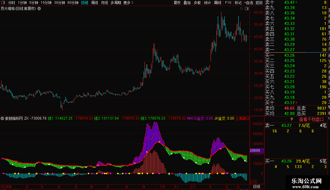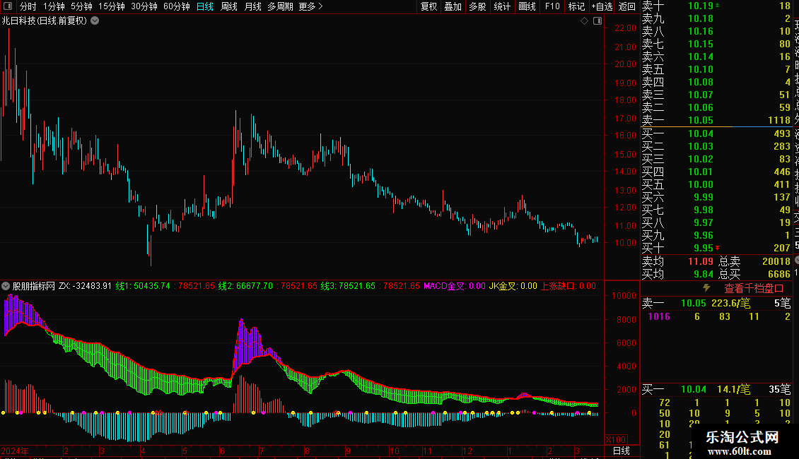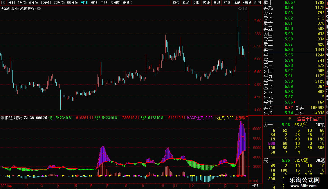 线A1:=(MA(VOL,5)+MA(VOL,10)+MA(VOL,25))/3,COLOR00FF00;线A2:=(MA(VOL,5)+MA(VOL,10)+MA(VOL,20)+MA(VOL,60)+MA(VOL,120))/5,COLOR00FF00;线A3:=(MA(VOL,20)+MA(VOL,60)+MA(VOL,120))/3,COLOR00FF00,LINETHICK2;ZX:2*(线A1-线A2), COLORSTICK;STICKLINE(线A1>线A3,线A1,线A3,0.1,1),COLORFF0080;STICKLINE(线A1<=线A3,线A1,线A3,0.1,1),COLOR22CC33;线1:IF(线A1<线A3,线A1,线A3),COLOR00FF00;IF(线A1<线A3,线A3,线A1),COLORRED;线2:IF(线A2<线A3,线A2,线A3),COLOR00FF00;IF(线A2<线A3,线A3,线A2),COLORRED;线3:IF(线A3<线A1,线A3,线A3),COLOR00FF00,LINETHICK2;IF(线A1<线A3,线A3,线A3),COLORRED,LINETHICK2;DIFF:=EMA(CLOSE,26) - EMA(CLOSE,12);DEA:=EMA(DIFF,9);MACD:=(DIFF-DEA), COLORSTICK;MACD金叉:IF(CROSS(DIFF,DEA),MACD-0.02,0),COLORFF00FF,POINTDOT;DRAWTEXT(CROSS(DIFF,DEA),MACD-0.03,'●'),COLORFF00FF;TYP := (HIGH + LOW + CLOSE)/3;RSV:=(CLOSE-LLV(LOW,9))/(HHV(HIGH,9)-LLV(LOW,9))*100;K:=SMA(RSV,3,1);D:=SMA(K,3,1);J:=3*K-2*D;JK金叉:IF(CROSS(J,K),MACD-0.02,0),COLORYELLOW,POINTDOT;DRAWTEXT(CROSS(J,K),MACD-0.03,'●'),COLORYELLOW;上涨缺口:IF(L>REF(H,1),MACD-0.01,0),COLORRED,POINTDOT;DRAWTEXT(L>REF(H,1),REF(H,1),'☆'),COLORRED;