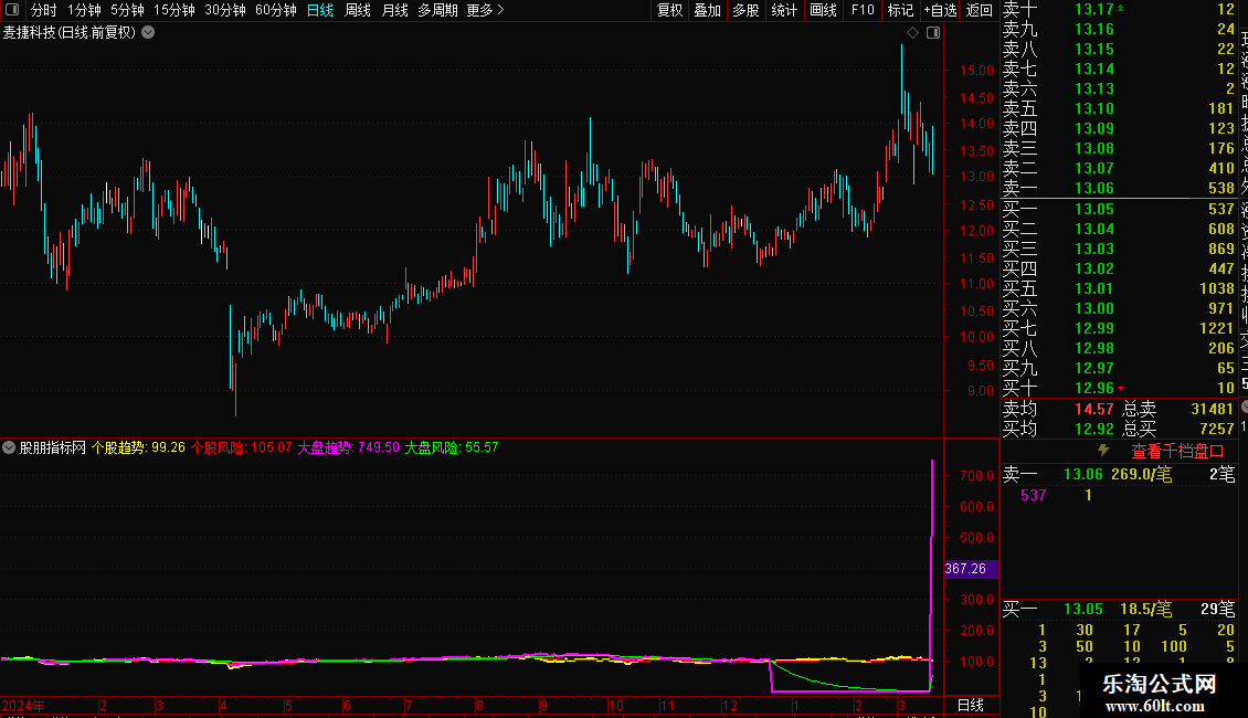 麒麟趋势指标是一个反映个股对比大盘的指标,我们知道,一个个股如果有短线资金大力推进的时候,其走势往往会独立与大盘,领先于大盘,在麒麟趋势中,表现个股趋势的是一根粗的白颜色的线,表示大盘趋势的是一根粗的绿的线,我们规定,只有当代表股价的白颜色的线向上穿越了代表大盘的绿线,才能说明个股的短线攻击强度已经具备向上攻击的能量。