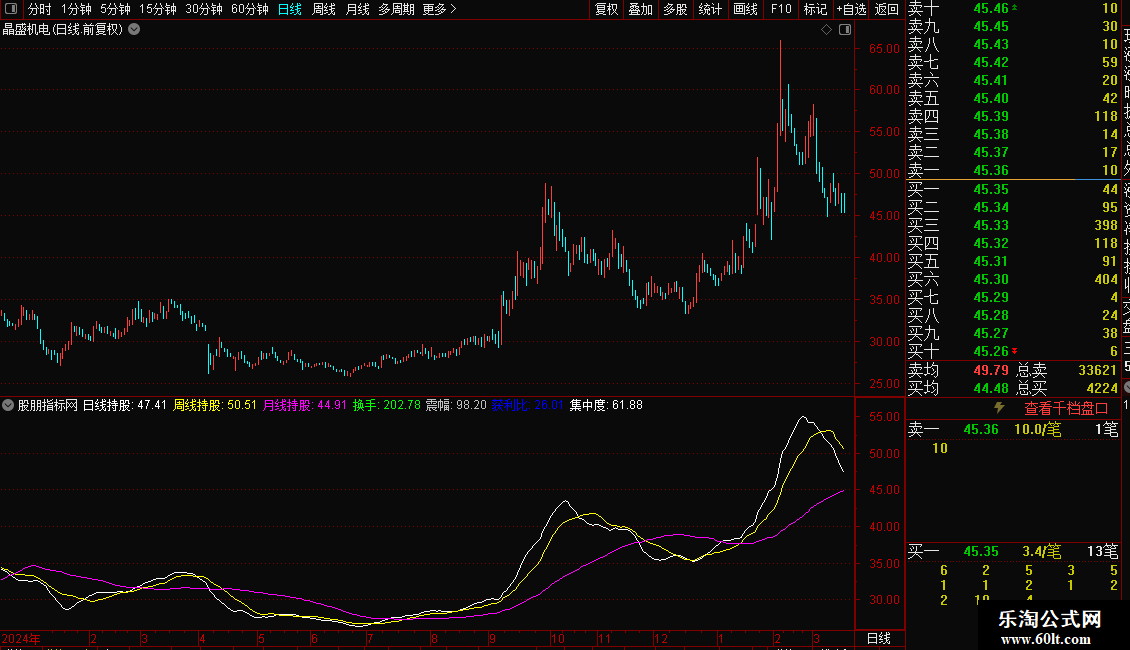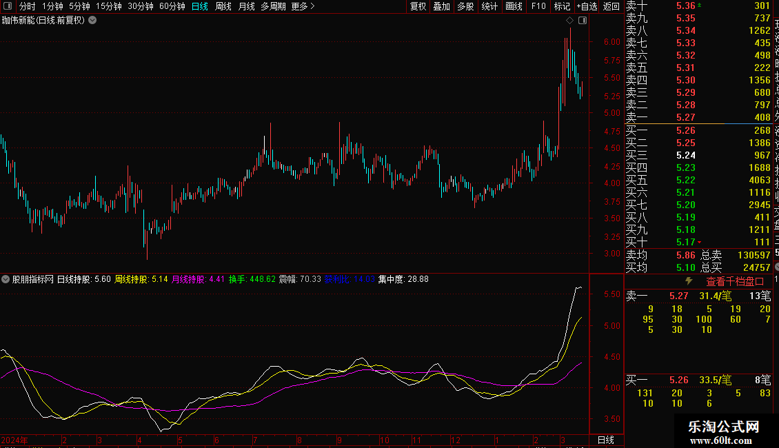 牛股:=日线持股>1 AND 换手>100 AND 获利比>85 AND 集中度<30 AND 强势=1 AND 出现涨停 AND 三日涨幅<20 AND 二十涨幅<50;