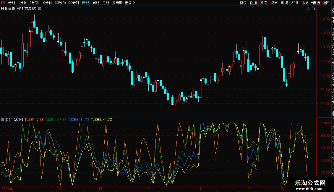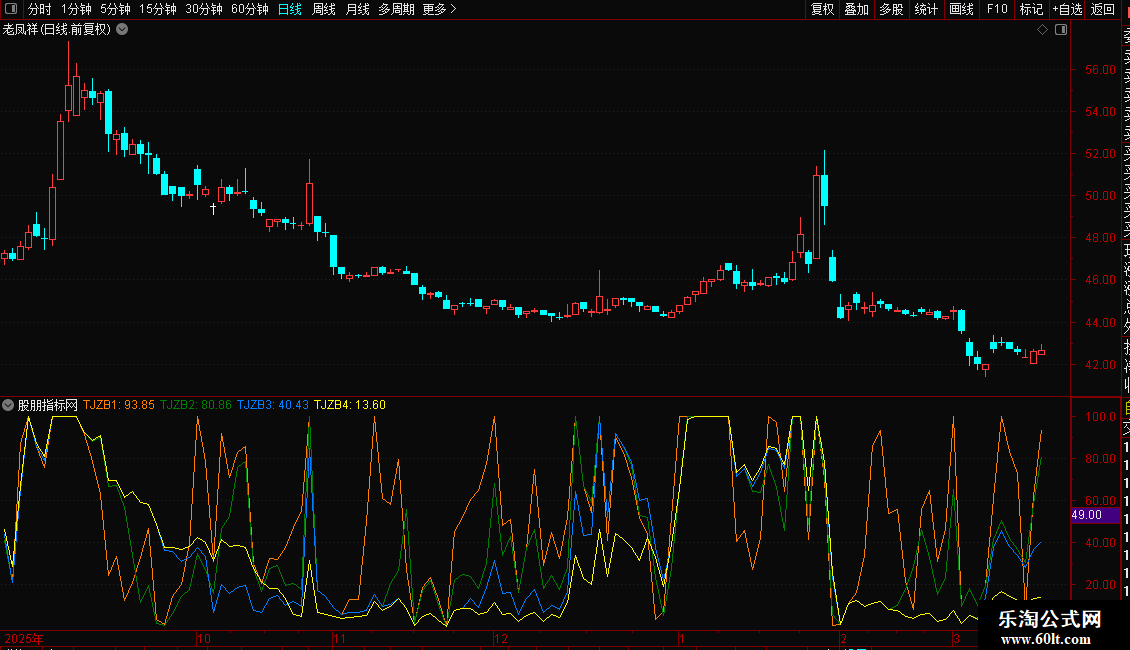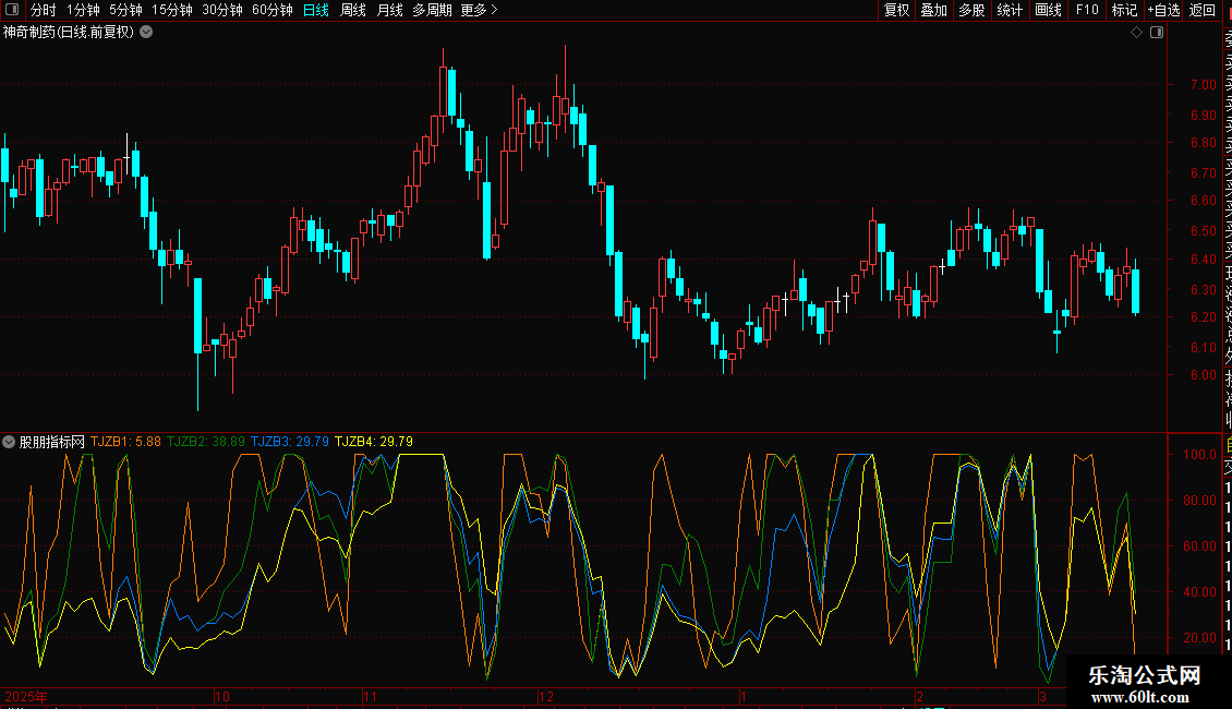 由于有上下边界的技术指标在接近边界(95以上,5以下)地方钝化,图形不直观,方向性不强。能否改善这个区间,让指标的方向性更强。笔者选用了WR和RSI指标配搭,以0-100为上下界,50为中轴,上强下弱。区间(5-95)用法同RSI。由于有上下界的局限,计算时将强弱势区间(95-100,0-5)的指标值取100或0。这样使单边趋势运行的股票在持续上涨时候指标在100走平,反之在0走平。将一般技术指标的钝化表达为趋势,看起来更加直观。取5,10,20,30日来研判走势。软件中的投机指标分别用红、黄、蓝、白四线代表5日、10日、20日、30日投机指标。TJ5、TJ10、TJ20、TJ30后面的数值,则分别是四种周期投机指标当前的数值。