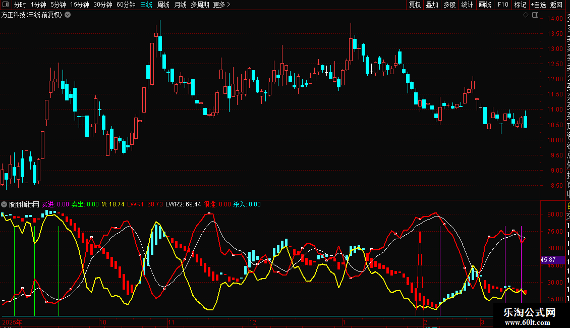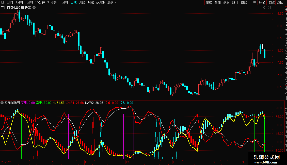 卖出:IF(D>75 AND CROSS(D,K) ,80,0),COLORGREEN,STICK;