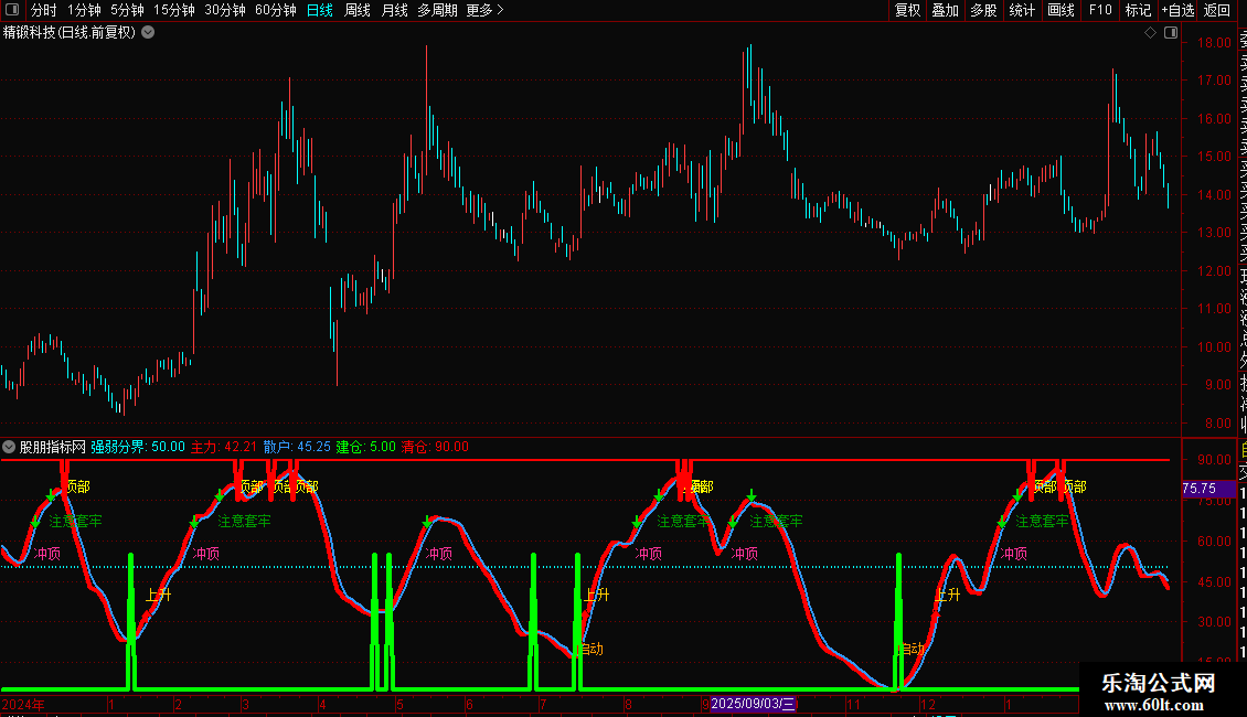 DRAWTEXT(CROSS(主力,65) AND 散户<主力,55,'冲顶 '),LINETHICK2,COLOR9933FF;