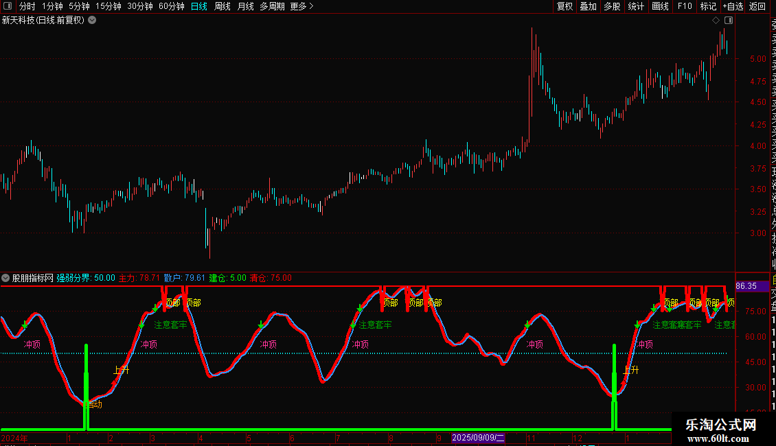 DRAWTEXT(CROSS(散户,主力) AND 散户>75,80,'顶部'),COLORYELLOW;