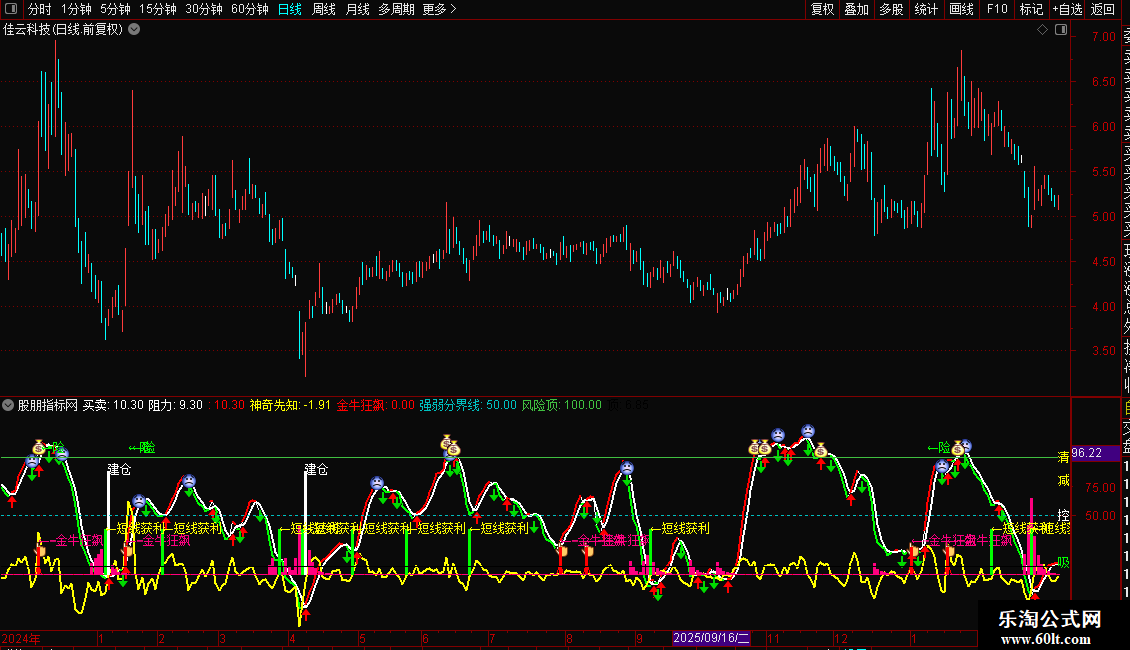 金牛狂飙:IF(CROSS(神奇先知,0) AND CROSS(买卖,阻力) AND 阻力>0 AND 阻力>REF(阻力,1) AND 五日内净流入>0 AND 五日内净流入>REF( 五日内净流入,1),10,0),COLORRED;