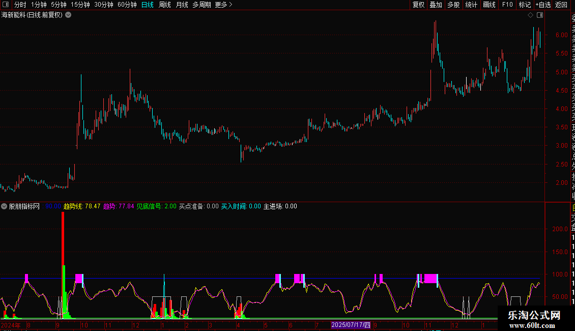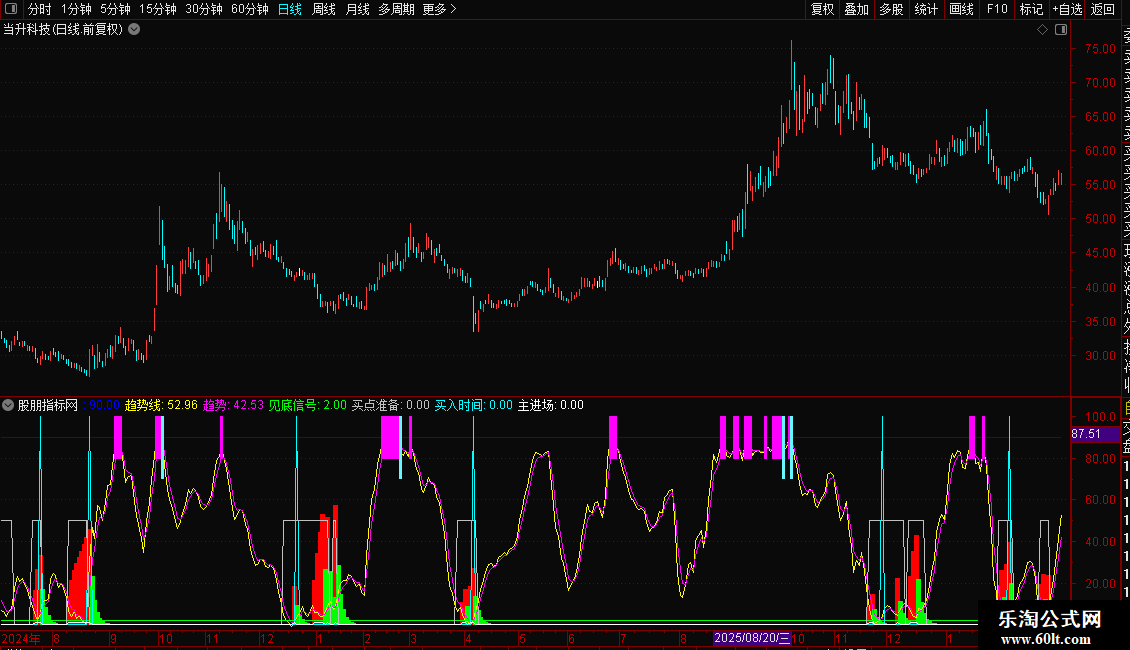 买入时间: IF(crOSS(趋势线,见底信号),100,0),COLORCYAN;