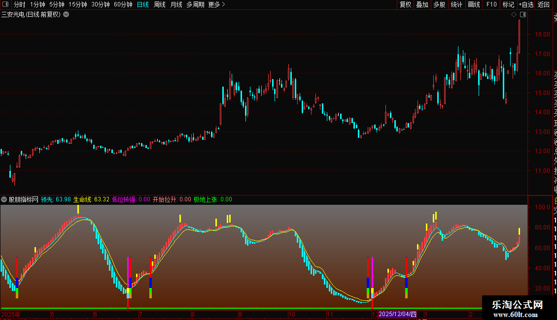 开始拉升:IF(CROSS(X_12,生命线) AND X_12>X_13 AND X_12<55 AND CLOSE>OPEN,50,0),POINTDOT,COLORLIRED;