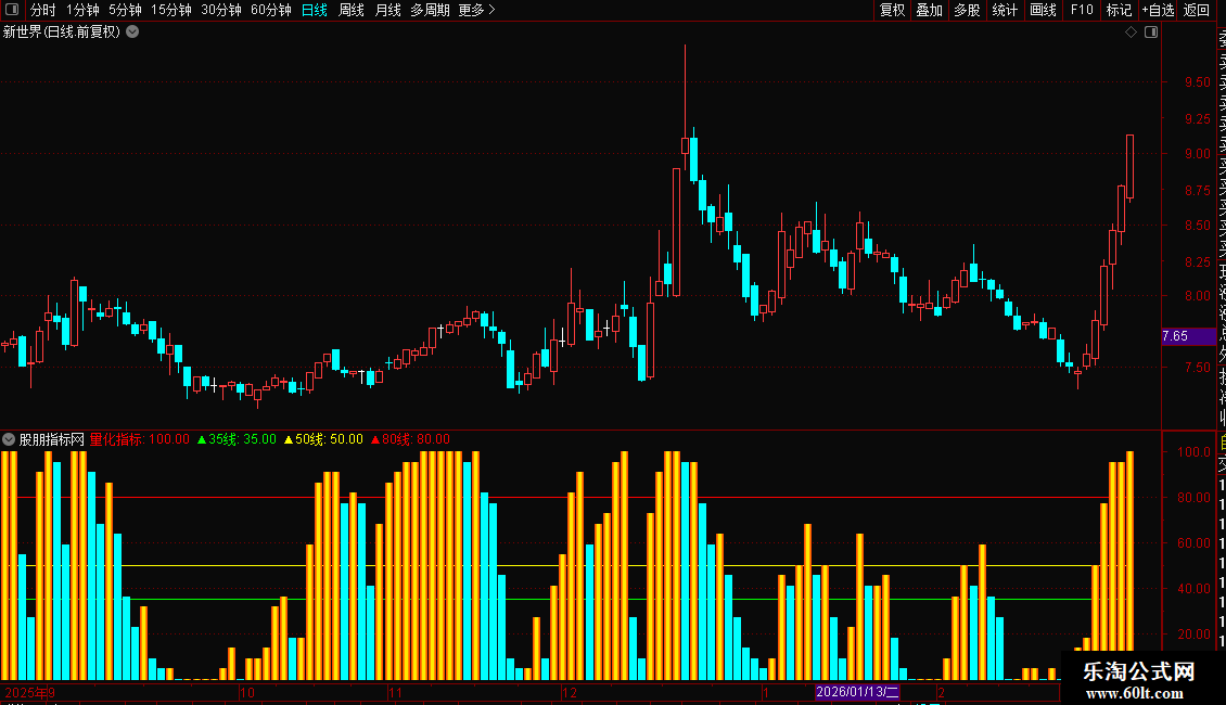 STICKLINE(量化指标>=REF(量化指标,1),0,量化指标,0.6,0),COLOR00C0FF;