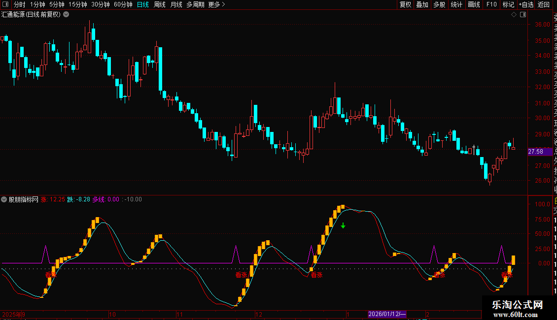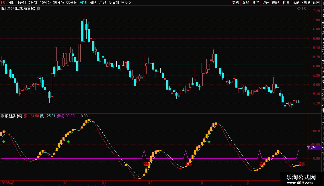 多线:IF(CROSS(涨,跌) AND 跌<-10,30,0),LINETHICK1,COLORFF00FF;