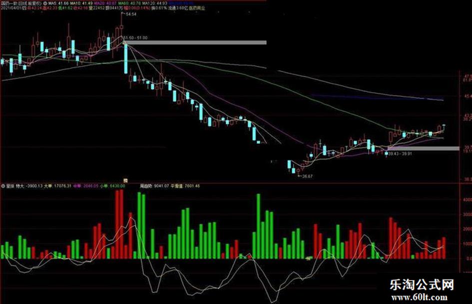 STICKLINE(标振1 AND 量振1 AND 周趋势>平滑值,0,A0,3,0),COLORYELLOW;
