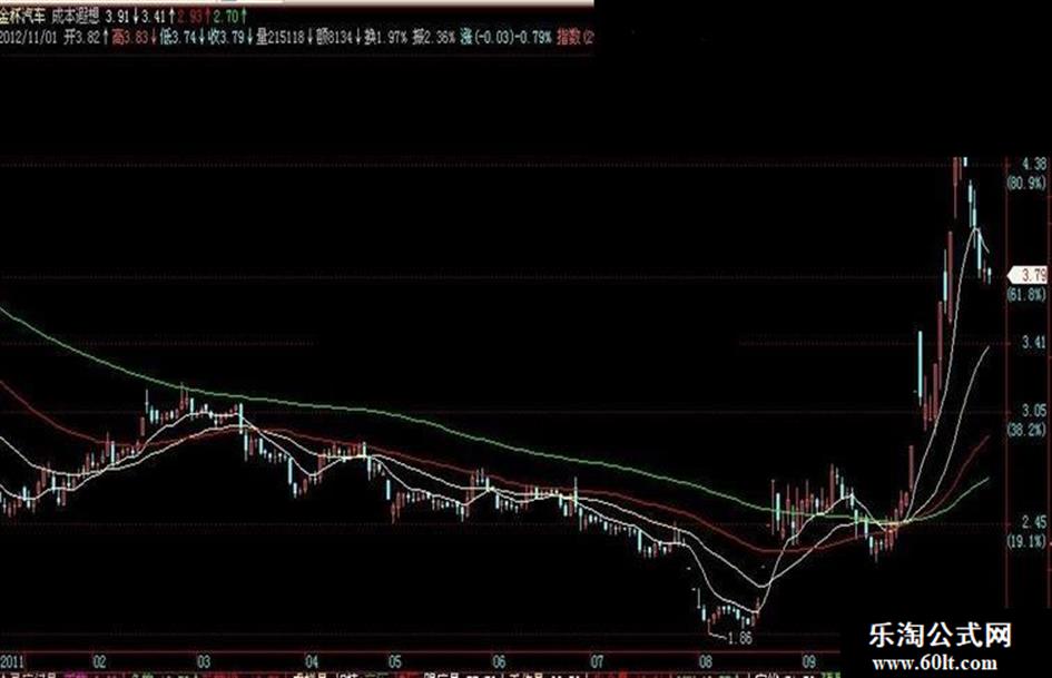 均线是表示N日内的平均成本,根据这一定义,我们假设在某一时期内5日成本占50%,10日平均成本+20日平均成本占50%,再按黄金分割对10和20日成本进行分割,估算某一时期内的平均成本。下面源码可对均线周期和成本分配进行调整,现提出大家讨论。