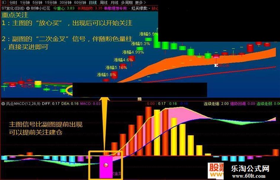 1:重点关注“二次金叉”粉色量柱,一般同时出现,说明后期拉升强度较高,作为最佳买进信号也不为过。