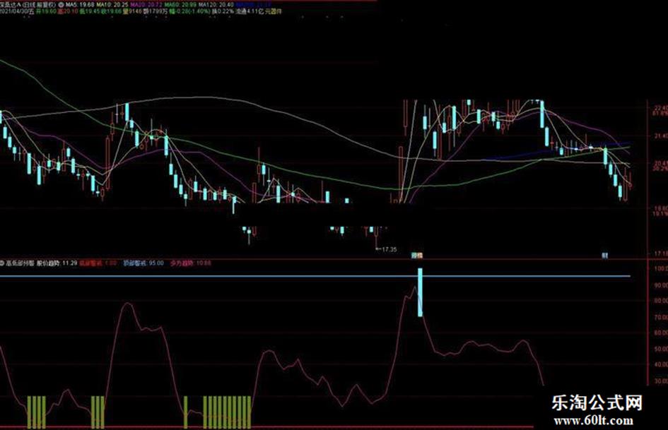 卖出警戒:STICKLINE(股价趋势>=100,100,80,2,0),STICK,COLORF00FF0,LINETHICK2;
