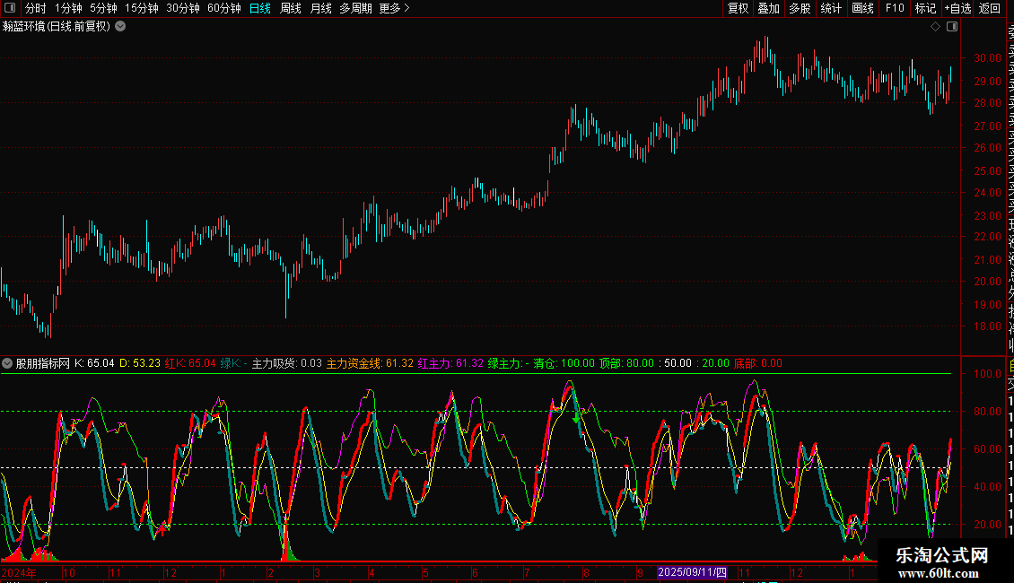 内有主力资金线,20以下低位,80以上拐头快跑。