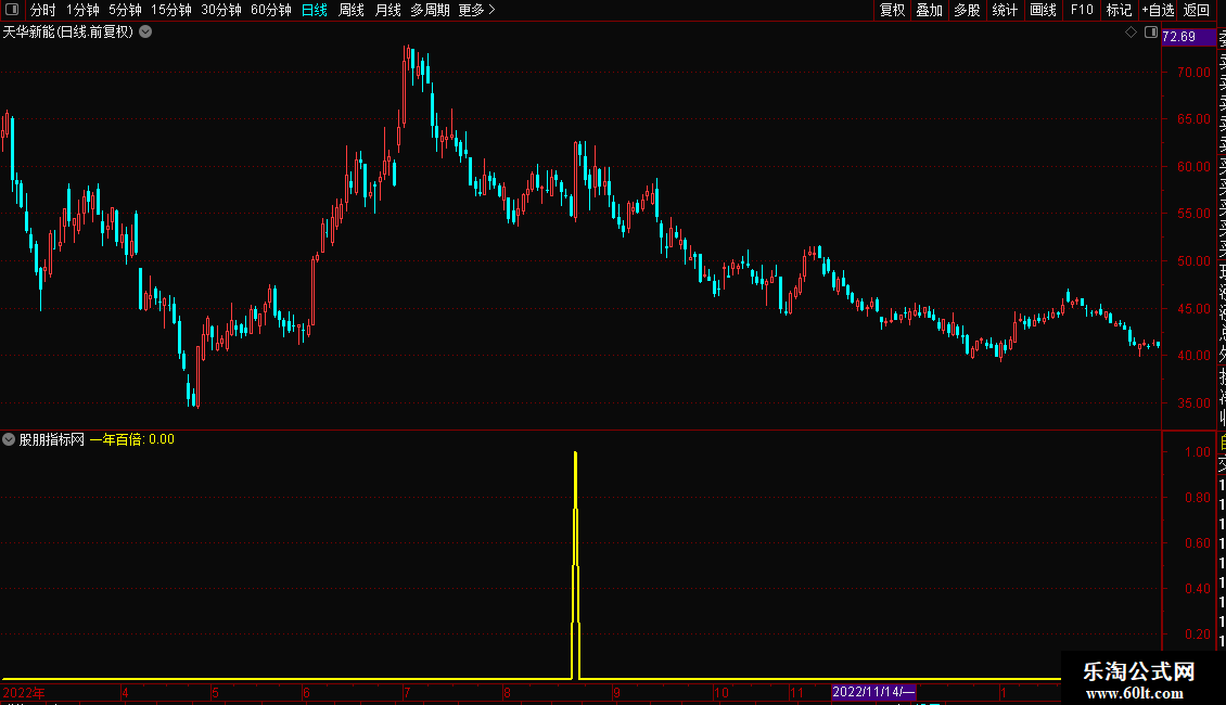 一年百倍:X_1 AND X_2 AND X_6 AND X_7 AND REF(CLOSE*1.11,1)<CLOSE,COLORYELLOW,LINETHICK2;
