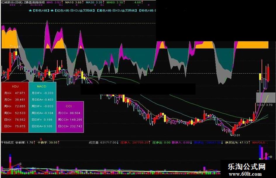 2,特别突出了KDJ指标,并在主图叠加,用彩色区别金叉和死叉,清晰。