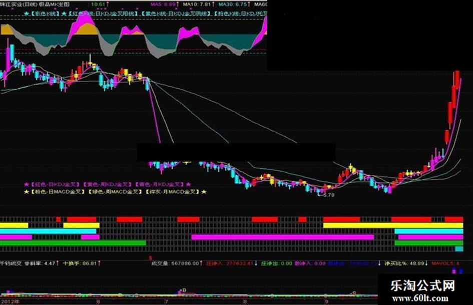 与1不同的是将MACD、KDJ传统指标的日、周、月指标情况用彩条方式表现,建议大家与《实用操盘小工具1》配合使用效果会更好一些。(如确有需要的话,可以发5.83版的综合指标