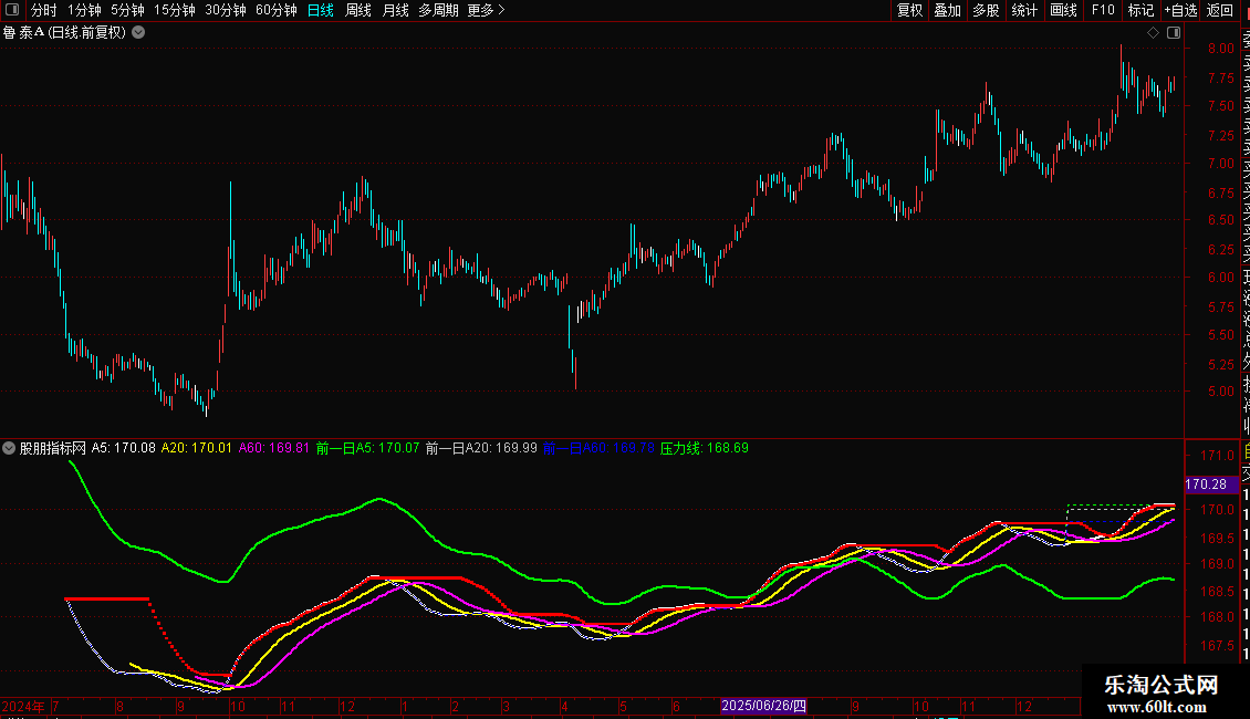 5,注意指标中前一日A5、前一日A20、前一日A60三条虚线随着股价的变化而变动,有时类似于缠论中的中枢却又有不同,当前一日A5、前一日A20、前一日A60多头排列时,股价趋势良好,当前一日A5逐渐下行,渐渐低于前一日A20、前一日A60时,注意变盘的风险。。。
