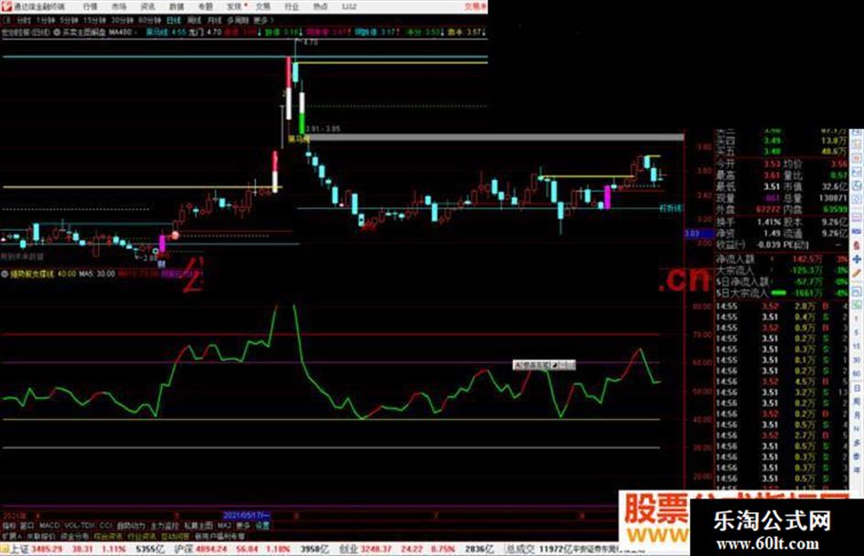 RSI:SMA(MAX(CLOSE-LC,0),14,1)/SMA(ABS(CLOSE-LC),14,1)*100,LINETHICK2,COLOR00FF00;