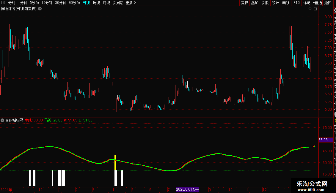 D: EMA(0.667*REF(K,1)+0.333*K,2),COLORGREEN,LINETHICK2;