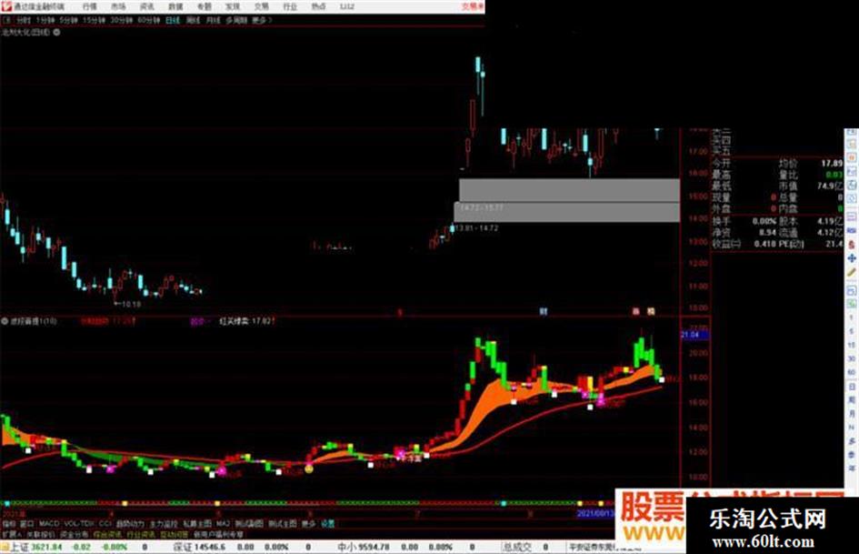 多空趋势彩带:DRAWBAND(SMA(C,6.5,1),RGB(255,97,0),SMA(C,13.5,1),RGB(0,128,0));