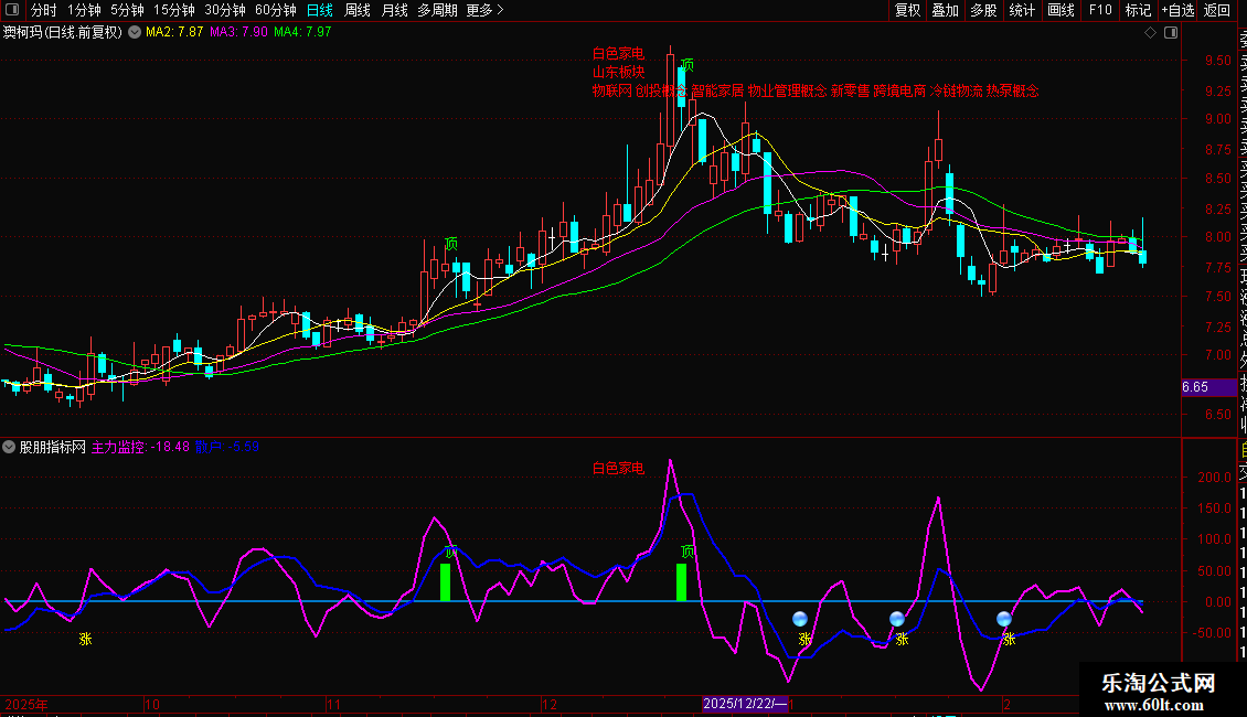 DRAWTEXT(CROSS(主力监控,散户) AND 主力监控<-10,-60,'涨'),COLORYELLOW;