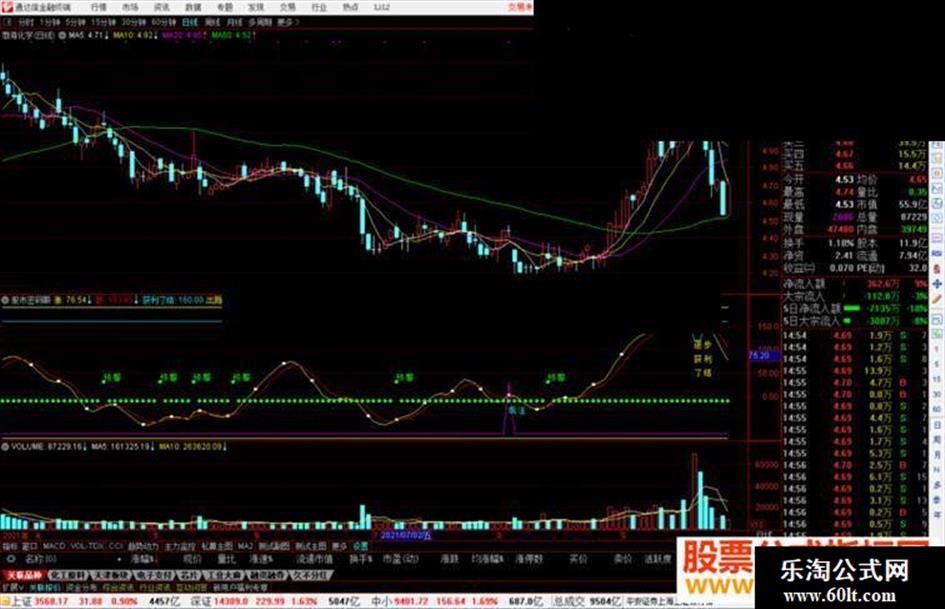 预警:IF(CROSS(涨,跌) AND 涨<-7,30,-10),COLORGREEN,CIRCLEDOT;