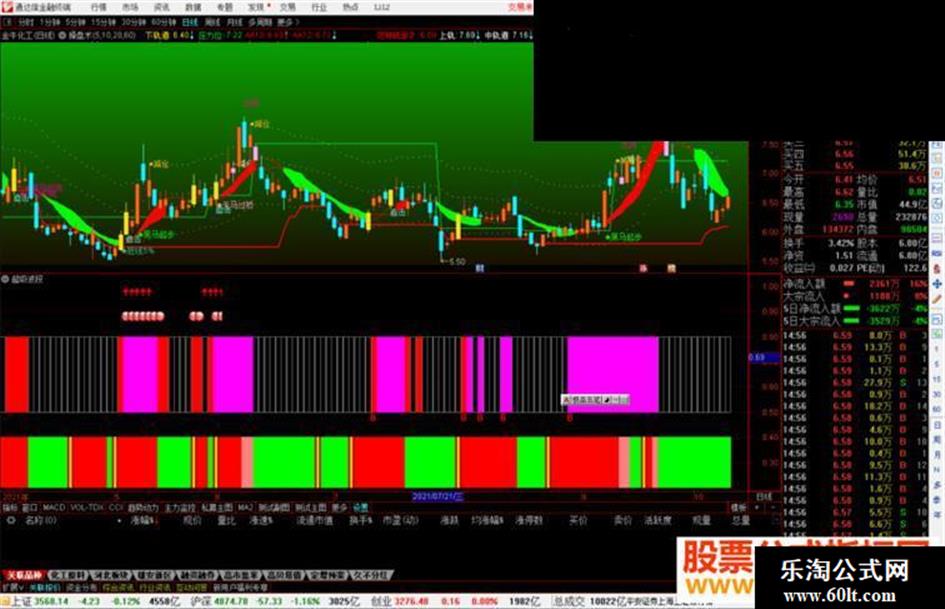 A1AA:=9;A2AA:=(REF(CLOSE,A1AA+1)<CLOSE);VAR66:=REF(C,1);VAR77:=SMA(MAX(C-VAR66,0),6,1)/SMA(ABS(C-VAR66),6,1)*100;DRAWGBK(C>0,RGB(10,160,0),RGB(25,15,0),0,' ',0);上:=(SMA(HIGH,21,2) * 1.05);DRAWTEXT(FILTER(((((CLOSE < REF(CLOSE,1)) AND (CLOSE < REF(CLOSE,1)))AND (HIGH > 上)) AND (CLOSE < 上)),5),(HIGH*0.995),'--减仓'),COLORFFFFFF;下轨道:(SMA(LOW,21,2) * 0.969),POINTDOT,COLOR00FFFF;BMA:=MA(CLOSE,118);阻挡:=(SMA(HIGH,21,2) * 1.05);RSV:=(((CLOSE - LLV(LOW,13)) / (HHV(HIGH,13) - LLV(LOW,13))) * 100);K:=SMA(RSV,3,1);D:=SMA(K,3,1);J:=((3 * K) - (2 * D));RSV12:=(((CLOSE - LLV(LOW,34)) / (HHV(HIGH,34) - LLV(LOW,34))) * 100);K12:=SMA(RSV12,3,1);D12:=SMA(K12,3,1);J12:=((3 * K12) - (2 * D12));RSV24:=(((CLOSE - LLV(LOW,55)) / (HHV(HIGH,55) - LLV(LOW,55))) * 100);K24:=SMA(RSV24,3,1);D24:=SMA(K24,3,1);J24:=((3 * K24) - (2 * D24));支撑位:=IF(CROSS(J,J24),LOW,REF(LOW,BARSLAST(CROSS(J,J24))));压力位:IF(CROSS(J24,J),HIGH,REF(HIGH,BARSLAST(CROSS(J24,J)))),COLOR00FF00;U2L:=IF((CLOSE >= MA(CLOSE,20)),80,50);L2L:=IF((CLOSE >= MA(CLOSE,20)),50,20);RH1:=IF(((J < U2L) AND (REF(J,1) >= U2L)),HHV(REF(HIGH,1),(BARSLAST(((J >= U2L)AND (REF(J,1) < U2L))) - 1)),REF(HHV(REF(HIGH,1),(BARSLAST(((J >= U2L)AND (REF(J,1) < U2L))) - 1)),BARSLAST(((J < U2L) AND REF(J,1)))));RH4:=IF((HIGH > RH1),LOW,REF(LOW,BARSLAST((HIGH > RH1))));RH42:=IF((HIGH > RH1),J,REF(J,BARSLAST((HIGH > RH1))));RH5:=IF((((HIGH > RH4) AND (J < RH42)) AND (J < J24)),HIGH,REF(HIGH,BARSLAST((((HIGH > RH4) AND (J < RH42)) AND (J < J24)))));RL1:=IF(((J > L2L) AND (REF(J,1) <= L2L)),LLV(REF(LOW,1),(BARSLAST(((J <= L2L)AND (REF(J,1) > L2L))) - 1)),REF(LLV(REF(LOW,1),(BARSLAST(((J <= L2L)AND (REF(J,1) > L2L))) - 1)),BARSLAST(((J > L2L) AND REF(J,1)))));RL4:=IF((LOW < RL1),HIGH,REF(HIGH,BARSLAST((LOW < RL1))));RL42:=IF((LOW < RL1),J,REF(J,BARSLAST((LOW < RL1))));RL5:=IF((((LOW < RL4) AND (J > RL42)) AND (J > J24)),LOW,REF(LOW,BARSLAST((((LOW < RL4) AND (J > RL42)) AND (J > J24)))));CB:=((AMOUNT / VOL) / 100);CD:=((CB > HIGH) OR (CB < LOW));黑马趋势:=MA(CLOSE,3);MAP:=MA(CLOSE,8);AA5:=MA(CLOSE,21);AA10:MA(CLOSE,8),COLOR0000FF;AA12:MA(CLOSE,12),COLOR0000FF;BB10:=((ATAN((AA10 - REF(AA10,1))) * 3.1416) * 10);BB12:=((ATAN((AA12 - REF(AA12,1))) * 3.1416) * 10);MA13:=MA(CLOSE,13);DRAWTEXT(FILTER(((((((CLOSE / OPEN) > 1.04) AND ((CLOSE - REF(CLOSE,1)) > 0))AND (CLOSE > 下轨道)) AND ((AA10 - REF(AA10,1)) > 0)) AND (CLOSE < 上)),3),(LOW - 0.07),'追击'),COLORD1E768;AA100:=IF(((AA12 <= AA10) AND (BB12 >= 1)) AND (BB10 >= 1),AA10,DRAWNULL);AA122:=IF(((AA12 >= AA10) AND (BB10 <= 1)) AND (BB10 <= 1),AA12,DRAWNULL);DRAWBAND(AA100,RGB(250,0,0),AA12,RGB(0,250,0));DRAWBAND(AA122,RGB(0,250,0),AA10,RGB(250,0,0));VARD:=((((OPEN + LOW) + HIGH) + CLOSE) / 4);支撑:=EMA(VARD,5);短期底部:=LLV(OPEN,30);DRAWTEXT(((((((CROSS(黑马趋势,短期底部) AND ((RL5 - REF(RL5,1)) > 0))AND ((黑马趋势 - REF(黑马趋势,1)) > 0)) AND (黑马趋势 > 1)) AND (LOW <= 支撑位))AND (CLOSE > 支撑位)) AND (HIGH < 压力位)),(LOW - 0.15),'←黑马发现'),COLOR00FFFF;DRAWTEXT((((((((CROSS(黑马趋势,RL5) AND ((黑马趋势 - REF(黑马趋势,1)) > 0))AND (HIGH < 压力位)) AND (LOW <= 短期底部)) AND (CLOSE > 支撑位)) AND (CD < 1))AND (CLOSE > OPEN)) AND (CLOSE > RL5)),LOW,'←短买'),COLOR00FF00;DRAWTEXT(FILTER((((((((LOW <= 短期底部) AND ((CLOSE - REF(CLOSE,1)) > CLOSE))AND ((MA(CLOSE,10) - REF(MA(CLOSE,10),1)) > 0)) AND (WINNER(CLOSE) < 0.05))AND (短期底部 = RL5)) AND (LOW <= RL5)) AND (HIGH < 压力位)),3),LOW,'★机会难得'),COLORFFFFFF;历史大底:DRAWTEXT(FILTER((((((LLV(LOW,0) AND (WINNER(CLOSE) < 0.08))AND (LOW <= 短期底部)) AND (CLOSE > 短期底部)) AND (J < 80))AND ((CLOSE / OPEN) > 1.08)),20),(LOW - 0.45),'★★历史大底');DRAWTEXT(FILTER(((((((((LOW <= 短期底部) AND (CLOSE > 压力位))AND ((AA5 - REF(AA5,1)) > 0)) AND (J < 80)) AND (CLOSE > 支撑位))AND ((黑马趋势 - REF(黑马趋势,1)) > 0)) AND (WINNER(CLOSE) < 0.1))AND (CLOSE > OPEN)),5),(LOW - 0.15),'★黑马登天'),COLORCDEEC5;X1:=(((((3 * CLOSE) + HIGH) + LOW) + OPEN) / 6);X2:=EMA(X1,10);X3:=REF(X2,1);X4:=((REF(HIGH,1) + REF(LOW,1)) / 2);X5:=(MA(CLOSE,21) + (2 * STD(CLOSE,21)));X6:=REF(CLOSE,1);X7:=((SMA(MAX((CLOSE - X6),0),7,1) / SMA(ABS((CLOSE - X6)),7,1)) * 100);X8:=CROSS(79,X7);X9:=FILTER(X8,4);MAP1:=MA(CLOSE,60);均线30:=MA(CLOSE,30);均线89:=MA(CLOSE,89);均线:=MA(CLOSE,16);均线34:=MA(CLOSE,34);均线55:=MA(CLOSE,55);VAR1:=EMA(CLOSE,8);VAR2:=EMA(VAR1,20);VAR3:=CROSS(VAR1,VAR2);VAR4:=(VAR1 < MA(CLOSE,60));VAR5:=(((HHV(HIGH,36) - CLOSE) / (HHV(HIGH,36) - LLV(LOW,36))) * 100);VAR6:=SMA(VAR5,5,1);VAR7:=SMA(VAR6,8,1);VAR8:=(CROSS(VAR6,VAR7) AND (VAR7 < 16));VAR9:=((CLOSE > (LLV(CLOSE,60) + (0.3 * LLV(CLOSE,60)))) AND VAR8);VARA:=IF((CLOSE > 1000),VAR8,VAR9);黑马起步:=(VAR3 AND VAR4);逃遁:=VARA;均线20:=MA(CLOSE,20);均线120:=MA(CLOSE,120);牛熊线:=MA(CLOSE,250);VA:=CROSS(MA(CLOSE,19),MA(CLOSE,120));VB:=(MA(CLOSE,20) > MA(CLOSE,120));VC:=CROSS(MA(CLOSE,120),MA(CLOSE,89));VD:=(MA(CLOSE,20) < MA(CLOSE,120));VE:=CROSS(MA(CLOSE,20),MA(CLOSE,250));VF:=(MA(CLOSE,20) > MA(CLOSE,250));VG:=CROSS(MA(CLOSE,250),MA(CLOSE,20));DRAWTEXT(FILTER(((((((((OPEN > 均线120) AND (均线20 < 均线120))AND (LOW <= 均线120)) AND ((均线20 - REF(均线20,1)) > 0)) AND (CLOSE > OPEN))AND ((均线120 - REF(均线120,1)) > 0)) AND (HIGH < RH5))AND (CLOSE >= 均线120)),15),LOW,'★120跳马'),COLOR0089E0;DRAWTEXT((((VA AND ((均线120 - REF(均线120,1)) > 0)) AND (HIGH < RH5))AND (CLOSE > OPEN)),LOW,'★宝马望月'),COLORFFFFFF;DRAWTEXT((((((均线 - REF(均线,1)) > 0) AND CROSS(均线20,均线120))AND (LOW <= 均线120)) AND (CLOSE >= 均线120)),LOW,'三线开花'),COLORFFFFFF;短期底部2:LLV(HIGH,30),LINETHICK2,COLOR0000FF;上轨:(SMA(HIGH,21,2) * 1.092),POINTDOT,COLORFFFFFF;中轨道:(SMA(HIGH,21,2) * 1.017),POINTDOT,COLORFFFFFF;DRAWTEXT(FILTER(((((LOW < 下轨道) AND (CLOSE > MA(CLOSE,15)))AND (CLOSE > 短期底部2)) AND (HIGH < 压力位)),10),L