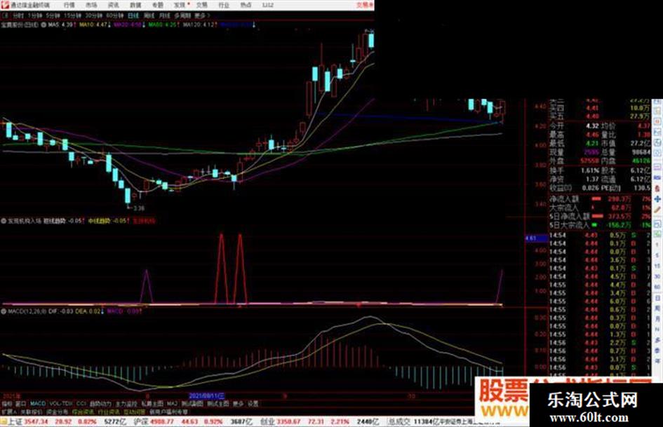 短线指标:IF(((((crOSS(短线趋势,中线趋势) AND (短线趋势 < 0)) AND (中线趋势 < (0 - 0.2)+4)) AND (VAR11 > 45)) AND (VAR16 > 0)),2.6,0.1),COLORMAGENTA;