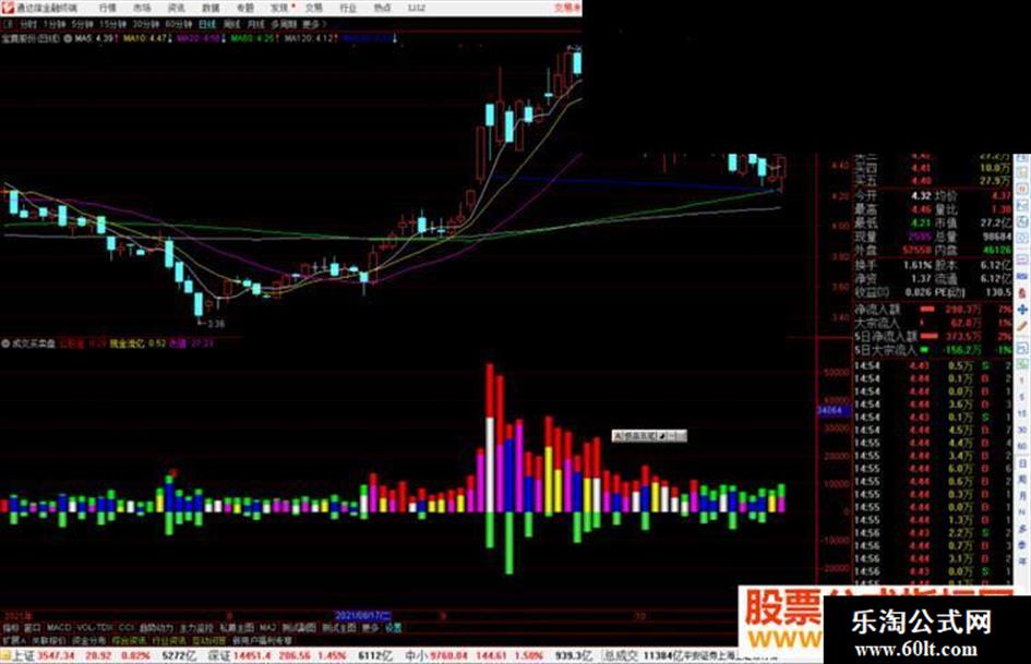 买盘赋值:如果(收阳线),返回(VAR1*(最高价-最低价)),否则返回如果(收阴线),返回(VAR1*((最高价-开盘价)+(收盘价-最低价))),否则返回(成交量(手)/2)
