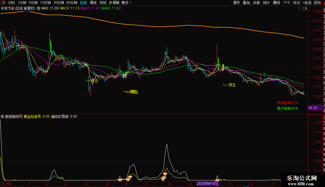 DRAWTEXT(选股,L*0.94,'↖一穿五'),COLORYELLOW;