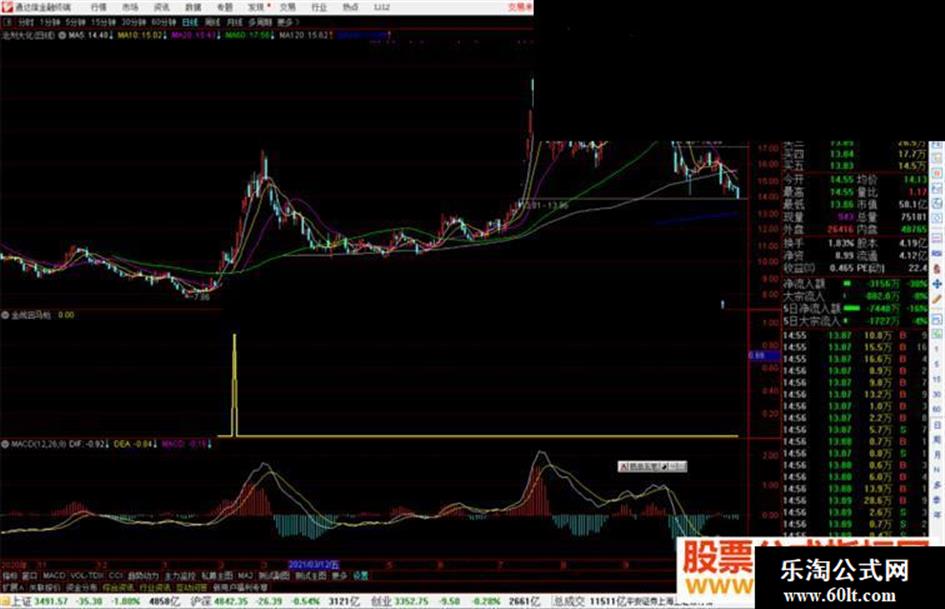 A1:=BARSLAST(C/REF(C,1)>1.095 AND C=H); A2:=IF(REF(L,A1)>REF(H,A1+1),REF(C,A1+1),REF(O,A1)); A3:=BETWEEN(A1,2,13); A4:=C>EMA(C,12)AND HHV(H,10)/LLV(L,10)<1.4; A5:=COUNT((C/O-1)*100<-7,13)=0; A6:=MA.MA1#WEEK>MA.MA2#WEEK; A7:=MA(C,5)>=A2 AND C>A2 AND C>=MA(C,5) AND REF(C,1)<=REF(MA(C,5),1) AND LLV(L,A1)<A2*1.045; A8:=IF(CODELIKE('300'),0,1)AND IF(CODELIKE('688'),0,1); A9:=CAPITAL/1000000<10 AND C>3 AND C<60; A10:=EXIST(CROSS(MACD.DIF,MACD.DEA),15)AND MACD.DIF>MACD.DEA; REF(A3,1) AND A4 AND A5 AND A6 AND A7 AND A8 AND A9 AND A10,COLORYELLOW,LINETHICK2;