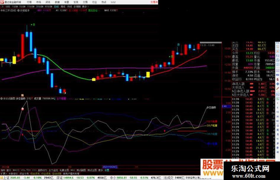 买点:=散户能量<0 AND 中户能量<0 AND 多空趋势>0 AND (CROSS(主力能量,大户能量) OR CROSS(主力能量,0));