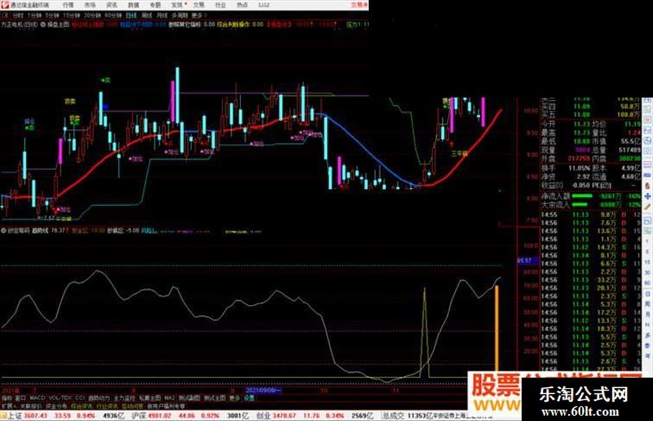 DRAWTEXT(锁定筹码>65 AND DIF>DEA AND 趋势线<1 AND CROSS(90,锁定筹码),锁定筹码*1.08,'▲财'),COLORWHITE;