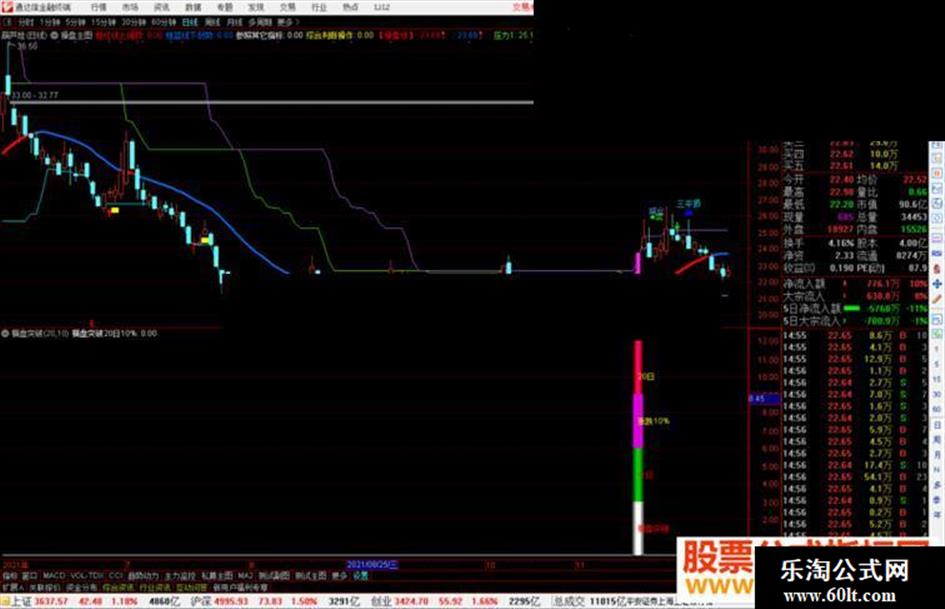 STICKLINE(IF(横盘突破20日10%,-120,0),+9,0,4,0),COLORDD00DD;